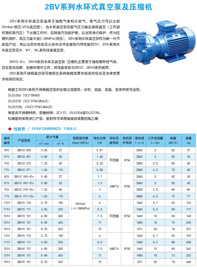 2BV水環(huán)真空泵適用于抽除氣體和水蒸氣,吸氣壓力可以達(dá)到33mbar壓力(97%真空度)。當(dāng)真空泵在吸氣壓力低于80mbar的狀態(tài)下長期工作時,應(yīng)聯(lián)接氣蝕保護(hù)管,以對泵進(jìn)行保護(hù)。如配大氣噴射器,吸氣壓力可達(dá)10mbar,噴射器可直接安裝在真空泵上。作為壓縮機(jī)用時,其壓力大至0.26MPa。
